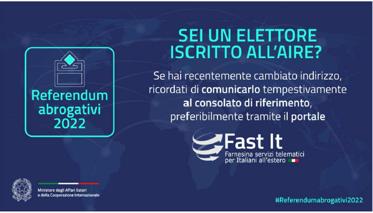 Si informano gli elettori e le elettrici italiani che per motivi di lavoro, studio o cure mediche si trovano temporaneamente all’estero per un periodo di almeno tre mesi nel quale ricade la data di svolgimento delle prossime consultazioni referendarie (referendum abrogativi ex art. 75 della Costituzione del 12 giugno 2022), nonché i familiari con loro conviventi, potranno esercitare il diritto di voto per corrispondenza (art. 4-bis, comma 1, legge 27 dicembre 2001, n. 459), ricevendo il plico elettorale contenente le schede per il voto all’indirizzo di temporanea dimora all’estero.