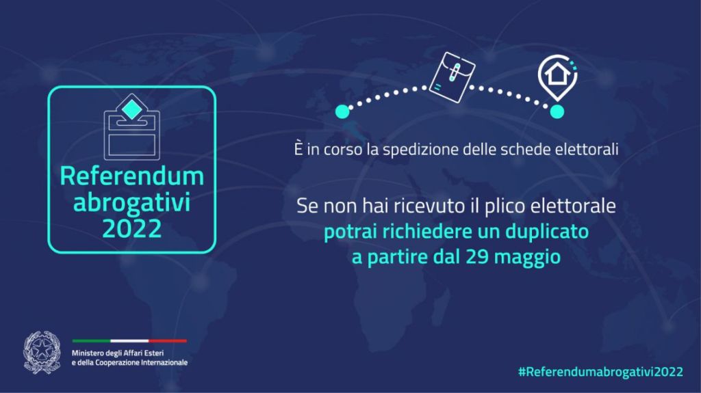 La informo che, è in corso la spedizione delle schede per i referendum abrogativi 2022. In caso di mancata ricezione del plico elettorale, l’elettore e l’elettrice possono richiedere un duplicato, a partire dal 29 maggio, scrivendo all’indirizzo consolare.yaounde@esteri.it. Cordiali saluti.