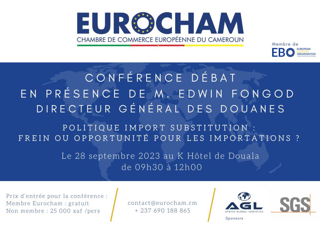 Le 28 septembre 2023 au K Hôtel de Douala, de 09h00 à 12h00, l’Eurocham Cameroon aura l’honneur de recevoir Monsieur EDWIN FONGOD NUVAGA, Directeur Général des Douanes pour échanger avec nos membres & partenaires sur le sujet suivant : “Politique d’import substitution : frein ou opportunité pour les importations ? “.