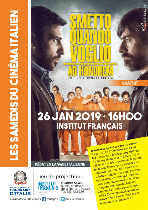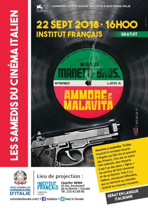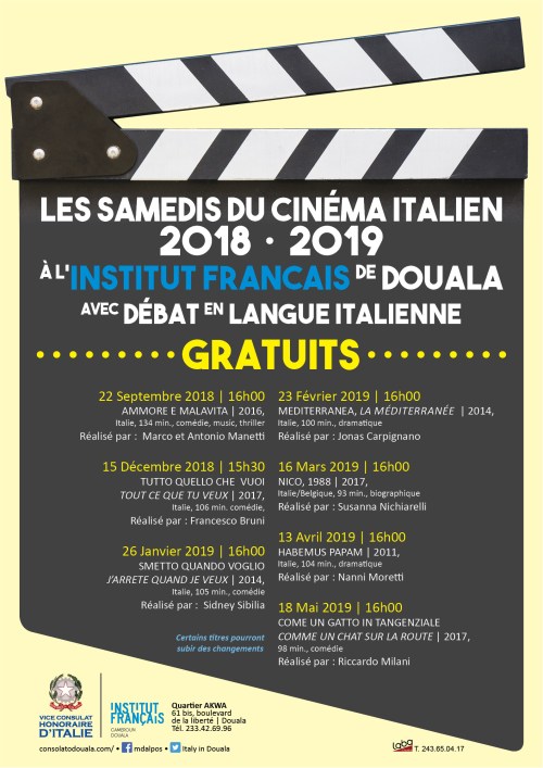 L’annuale rassegna cinematografica,“LES SAMEDIS DU CINEMA ITALIEN”, organizzata dall’anno 2010 al 2019. La rassegna è nata da un’idea e dall’impegno del Vice Console Onorario, con l’apporto dell’Istituto Francese. Le ultime edizioni, invece, sono state realizzate sotto la direzione dell’antropologa Dal Pos, che ha curato la selezione e la presentazione delle pellicole nonché la moderazione del dibattito ed i rapporti con l’Istituto Francese. Nel succedersi delle edizioni, l’evento ha registrato notevole apprezzamento e partecipazione, in particolare tra i giovani camerunensi che studiano l’italiano per frequentare le università italiane. I film in lingua italiana, sottotitolati in francese o in inglese, erano preceduti da una presentazione in lingua francese e susseguiti da un dibattito in lingua italiana e francese con il pubblico.