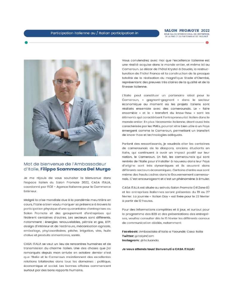 Vous conviendrez avec moi que l’excellence italienne est une réalité acquise dans le monde entier, et même ici au Cameroun. Le décor de l’hôtel Krystal à Douala, la restructuration de l’hôtel Franco et la construction de la presque totalité de la réalisation du magnifique Stade d’Olembé, représentent des preuves très claires de la qualité et de la finesse italienne.